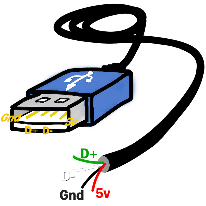 USBを使って通信をするには、USBを制御する専用のコントローラハードウェアが必要となるため、電子工作では少し難易度があがります。ただし、電源を使うだけならケーブルを切って電源のVcc線(+)とGnd線(-)を引き出すだけでよいので、スマホが普及しはじめるよりも早くから電源用ケーブルとしても使われるようになりました。