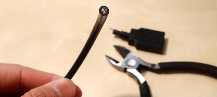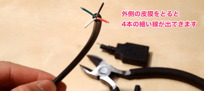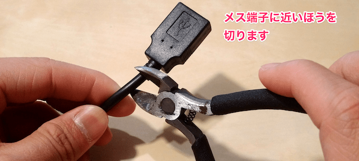 100円ショップで購入できるUSBケーブルは少なくとも一方がこの端子ですので、この端子から伸びるケーブルを十分長く残したうえでニッパで切断します。長さは、製作するモノによって適切に決めてください。あとから調整できるという意味では長めに切り取るのがよいでしょう。