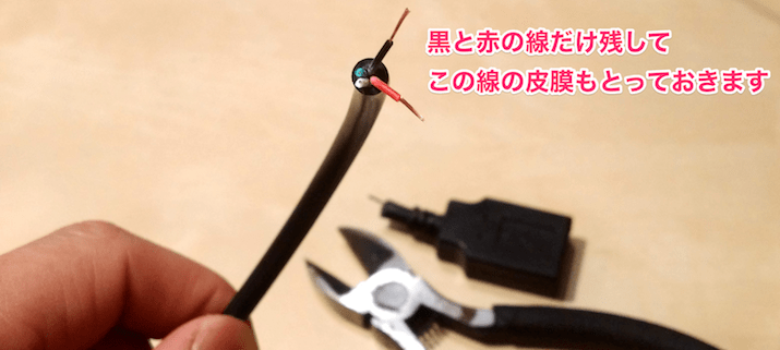 すると細い4本のケーブルが中から出てきますが、このうち赤色と黒色がそれぞれ電源となります。